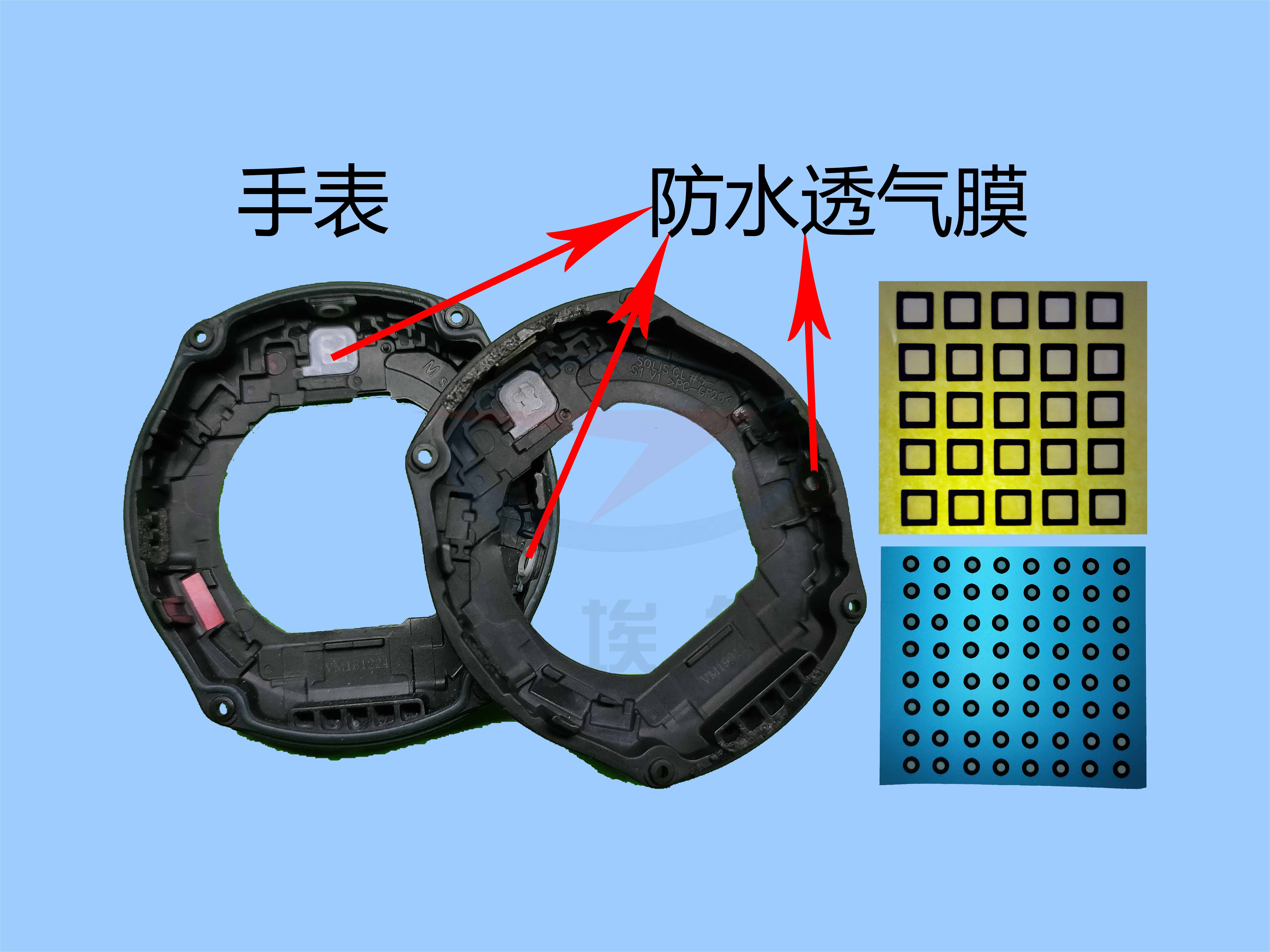 ?e-PTFE可穿戴電子設備防水透氣膜原材料有很好的防水透氣性能,因而防水透氣膜可以應用于智能手表,運動手環等戶外可穿戴電子設備產品的喇叭,麥克(MIC、咪頭)和泄氣孔處,實現防水,防塵,透聲,透氣功能。
