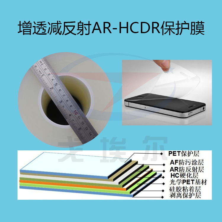 增減反射AR-HCDR保護膜的主要構造者由PET保護層、AF抗污抗污涂層、AR反射層、HC硬化層、光學PET基材、硅膠粘合層和剝離保護層組成。增減反射AR-HCDR保護膜的原理是利用納米AR涂層抑制強光反射,增加透明度。通過不同光波段的干涉,透光率增加3%-4%,減少或消除了透鏡鏡片、棱鏡、平面鏡等光學表面上的光學表面,從而增加了這些部件的透光率,從而提高了屏幕顯示的清晰度。